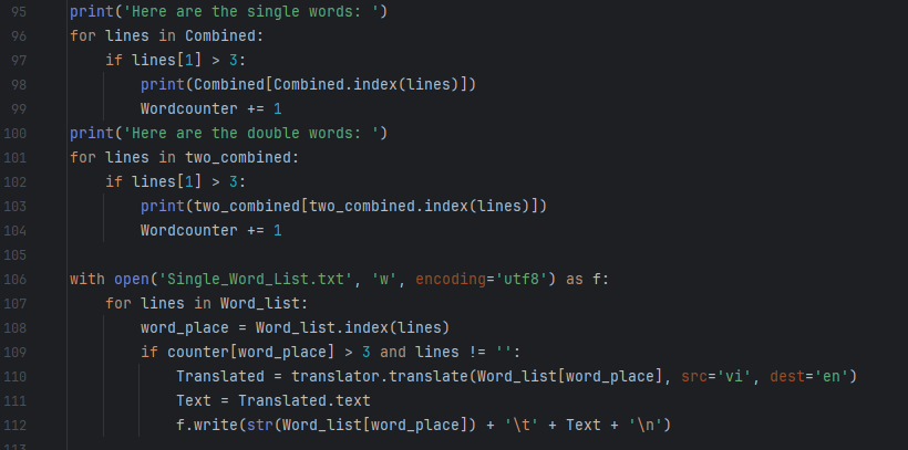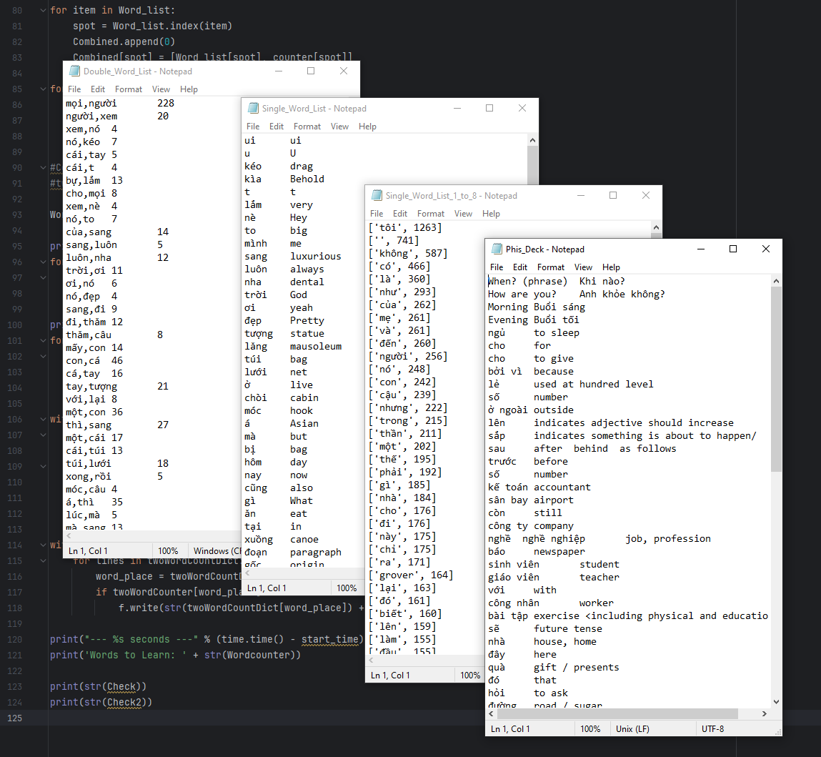 I also ran into several problems off the bat. Unlike romance languages that create compound words without spaces (i.e. prerequisite) Vietnamese creates these with a space between so that my word separator function could be dividing perfectly good words into their component parts. Now this isn’t inherently bad, these component words are also good to learn, but I needed to have the compound words as well.